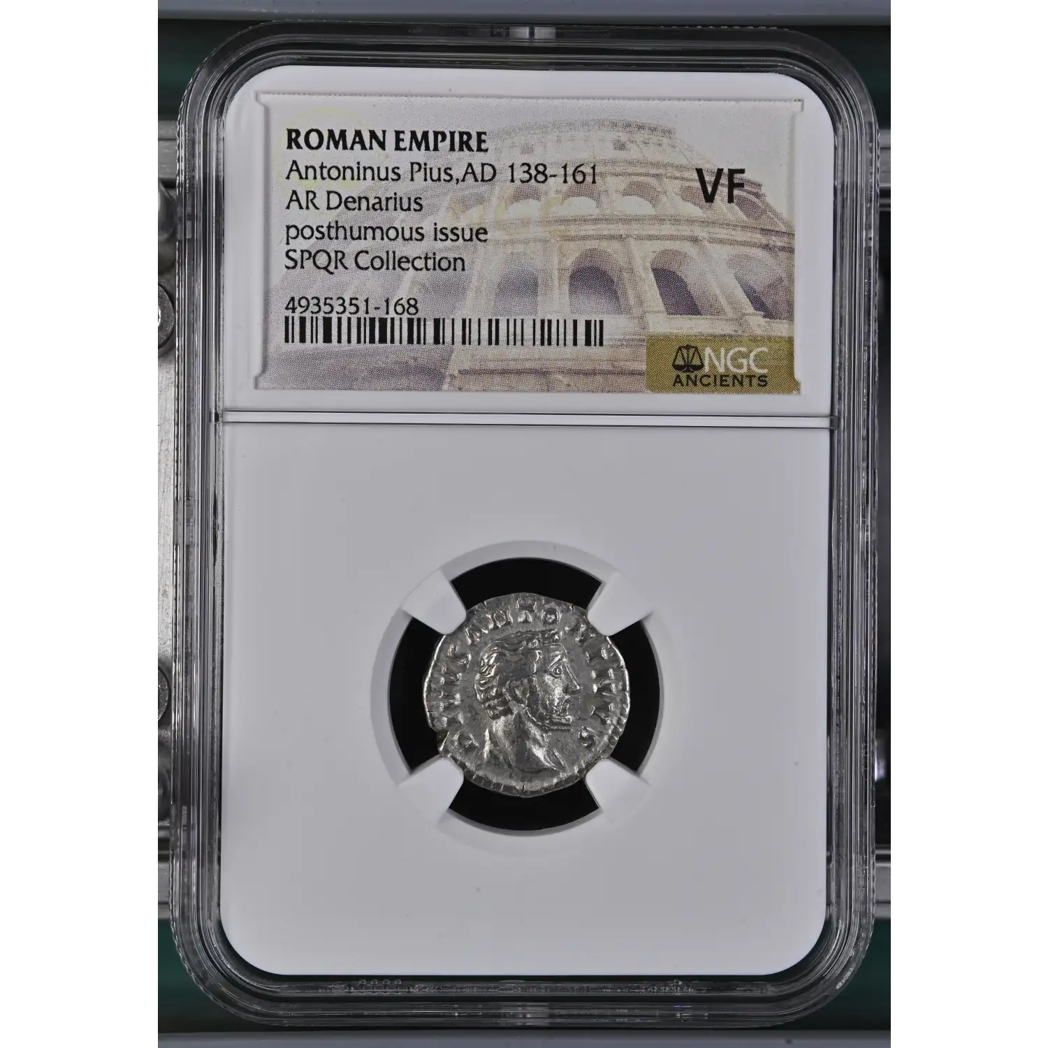 Discover the captivating legacy of the Roman Empire with this stunning AD 138-161 AR Denarius coin featuring the esteemed ruler, Antoninus Pius. This exquisite numismatic treasure, graded by the renowned NGC (Numismatic Guaranty Corporation) as Very Fine (VF), offers a tangible connection to the rich history of one of the world's most influential civilizations. Antoninus Pius, known for his benevolent and peaceful reign, ascended the imperial throne in AD 138, ushering in a period of stability and prosperity for the Roman Empire. This Denarius coin, minted during his reign, bears the unmistakable mark of the Roman imperial authority, serving as a testament to the enduring power and legacy of the Roman Empire. Crafted from high-quality silver, this Denarius coin showcases the intricate artistry and attention to detail that characterized Roman coinage. The obverse features a portrait of Antoninus Pius, the revered Roman emperor, while the reverse displays a captivating image of the goddess Pax, symbolizing the peace and stability that flourished under his leadership. Coin Type: Roman Empire AD 138-161 AR Denarius Ruler: Antoninus Pius Grading: NGC VF (Very Fine) Metal: Silver (AR) Obverse: Portrait of Antoninus Pius Reverse: Goddess Pax (Peace) Historical Significance: Antoninus Pius, renowned for his benevolent and peaceful reign, presided over a period of stability and prosperity in the Roman Empire. This Denarius coin, a tangible piece of ancient Roman history, offers a unique opportunity to own a remarkable numismatic treasure. Meticulously preserved and graded by the prestigious NGC, this coin not only captivates the collector's eye but also serves as a window into the grandeur and legacy of the Roman Empire. Whether you are a seasoned numismatist or a history enthusiast, this AD 138-161 AR Denarius coin featuring Antoninus Pius is a must-have addition to your collection. Immerse yourself in the timeless elegance and enduring significance of this remarkable piece of Roman history.